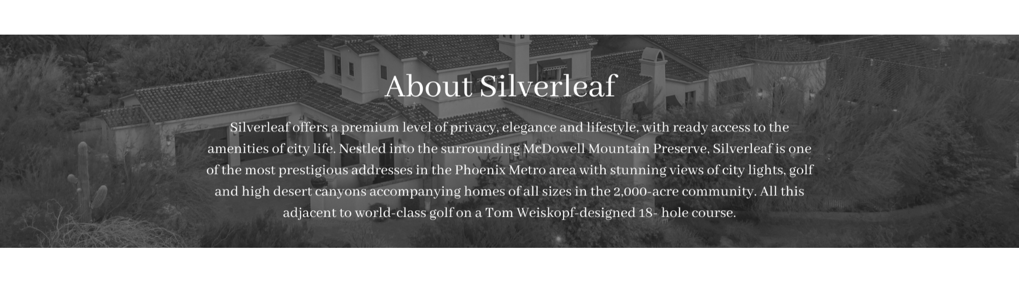 Experts in luxury real estate, Silverleaf Realty specializes in providing guidance to buyers and sellers in the Valley’s most prestigious addresses. Located in the Silverleaf Sales and Information Center in Canyon Village in DC Ranch, our team offers in-depth knowledge about the many real estate opportunities and rich lifestyle available in the area.